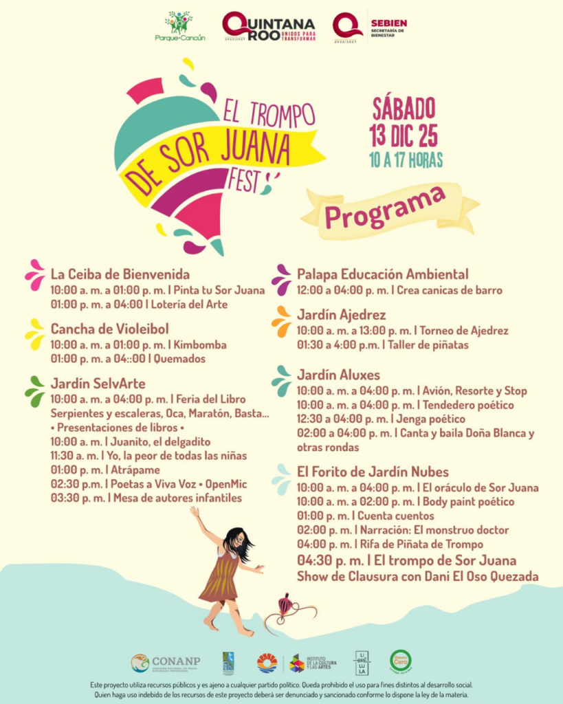 El Trompo de Sor Juana Fest se realizó el sábado 13 de diciembre en Parque Cancún como una celebración comunitaria dedicada a la poesía, los libros, la memoria, los juegos tradicionales y la figura de Sor Juana Inés de la Cruz.