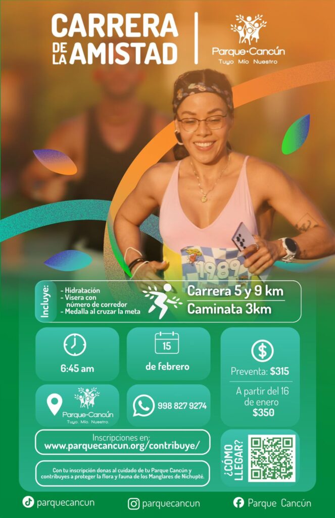 Se llevará a cabo el domingo 15 de febrero de 2026, su circuito será 100% dentro de Parque Cancún, ubicado en la Supermanzana 10, calle Popocatépetl, con una meta en el área verde del jardín Nubes.